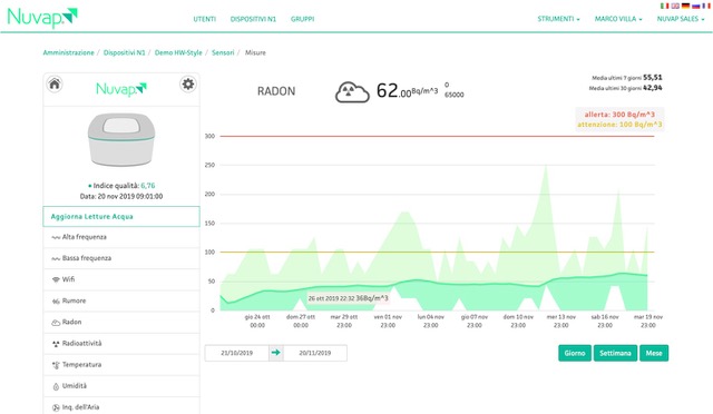 Antonella Santoro spiega che il dispositivo Nuvap ProSystem è “multi-sensori e collegato via WiFi al Cloud, resta sempre acceso e monitora in continuo aggiornando i dati 4 volte l’ora, mandandoli su piattaforma dove vengono archiviati ed elaborati, anche in forma grafica. Ogni inquinante, inoltre, è considerato per il suo valore massimo, minimo e medio. Questo perché i valori medi sono fondamentali da tenere in considerazione, poiché ad essi si riferiscono le norme e le best practice, più che ai valori istantanei. Esse variano per ogni parametro e tengono conto di un preciso intervallo di tempo, non sempre univoco (per esempio, la Co2 si calcola per intervalli di 8 ore – ndr)”.